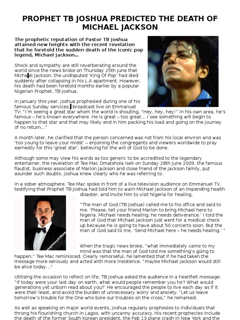 His death has been confirmed by the tb joshua ministries. In a generation without faith and hope. Prophet tb joshua predicted the death of michael jackson. The tb joshua fan club the tb joshua fan club is a group of individuals who love the ministry of pastor tb joshua of the synagogue church of all nations (scoan) in lagos, nigeria. The passing of my brother tb joshua saddens me deeply.